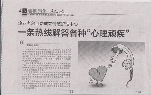 總經(jīng)理劉吉川先生的這一善行,受到了社會各界的廣泛關注,燕趙都市報、秦皇島晚報等各大媒體先后進行了采訪和報道。這也使得秦皇島市市民情感護理中心更廣泛的為人所知,從而能夠給廣大民眾提供更多的幫助,更好地服務于人民、服務于社會,最終為打造積極生態(tài)圈、構建和諧社會、實現(xiàn)偉大的中國夢貢獻力量!