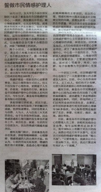 摘自《秦皇島晚報》(2014年10月15日,B15版):情感護理是一項新型的心靈慈善事業(yè),其以心理咨詢方式切入,但又不僅僅限于心理咨詢,更側重于人生觀、價值觀、幸福觀的引導。秦皇島市市民情感護理中心的創(chuàng)始人名叫劉吉川,今年51歲,秦皇島華電測控設備有限公司總經(jīng)理。