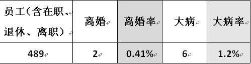 據(jù)統(tǒng)計,華電測控全體員工(含退休、離職人員)共計489人,從進入華電測控起(含不在職人員追蹤數(shù)據(jù)),直至現(xiàn)在離婚人數(shù)僅有兩人, 大病人數(shù)6人,其中還包括年逾六旬的退休人員等。