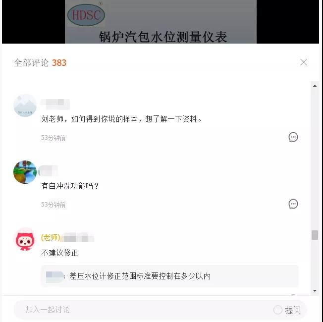 直播開始。劉吉川先生從當下“火力發電廠鍋爐汽包水位測量系統儀表安裝常見問題”開始講述,形象(圖文并茂)的向大家展示鍋爐汽包水位測量系統儀表現階段它所反應的實際情況??陀^的對各類水位儀表及安裝現象給予解析,并結合多年來電廠實際處置經歷,以專家的角度,多維度、跨專業為大家答疑解惑。同步在線收看收聽人數節節攀升,累計1300余人,反響熱烈。