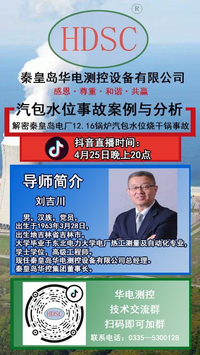 2020年4月25日晚8時,秦皇島華控集團有限公司董事長劉吉川先生攜手【熱控圈】舉辦“火力發電廠鍋爐汽包水位測量系統系列講座之解密秦皇島電廠12.16鍋爐汽包燒干鍋事故”。“千聊”、“抖音”、“釘釘”軟件同步直播。
