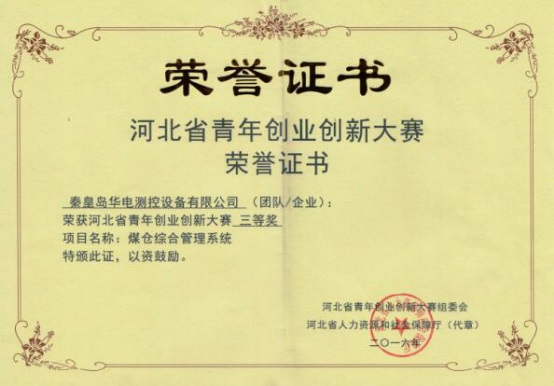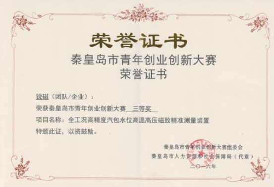為給用戶提供更好的產品和服務,華電測控始終致力于產品的研發和創新。早在2016年5月,公司組建“銳磁”和“新媒體”兩個團隊參加秦皇島市青年創業創新大賽,其中“銳磁”團隊的參賽項目為《全工況高精度汽包水位高溫高壓磁致精準測量裝置》,“新媒體”團隊的參賽項目為《煤倉綜合管理系統》,經過不斷開拓創新,兩個項目先后在市級、省級及國家級的比賽中連獲殊榮。《全工況高精度汽包水位高溫高壓磁致精準測量裝置》獲得秦皇島市青年創業創新大賽三等獎,第二屆“中國創翼”青年創業創新大賽高端設備制造類項“金翼獎”;《煤倉綜合管理系統》獲得秦皇島市青年創業創新大賽三等獎,河北省青年創業創新大賽三等獎,第二屆“中國創翼”青年創業創新大賽高端設備制造類項“銀翼獎”。