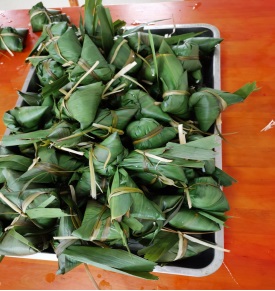 在大家齊心協力的共同努力下,滿滿一盤子粽子很快就包完了。真是驗證了團結就是力量這個道理。