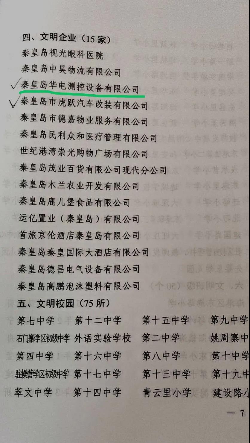 2020年4月,中共秦皇島市海港區(qū)委、區(qū)政府組織申報(bào)2019年度文明單位和文明個(gè)人,經(jīng)過(guò)推薦評(píng)審,近日獲悉華電測(cè)控榮獲文明單位稱號(hào)。
