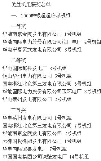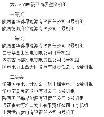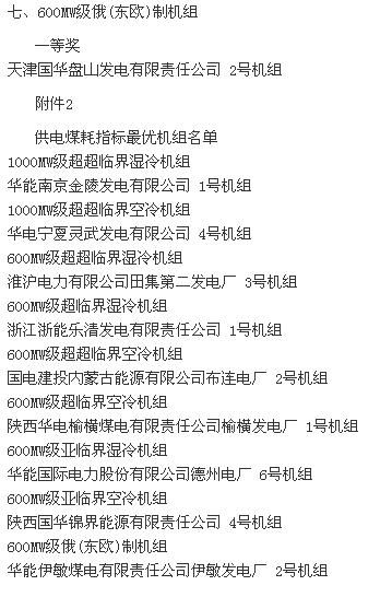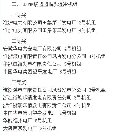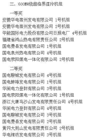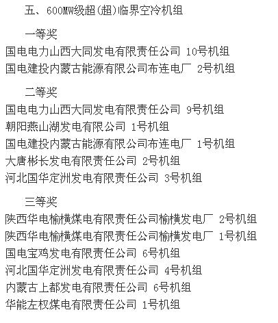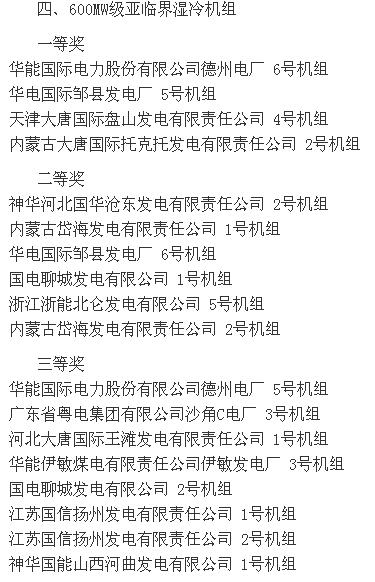 全國火電600MW級機組能效對標及競賽成果發布會,是對上一年度全國火電600MW級機組整體生產運行和管理工作的一次回顧和總結,是對機組運行和管理水平較好的企業和機組的全面肯定和確認。2016年上半年,機組競賽工作經過匯總及公示程序后,機組競賽辦公室組織各集團專家對排名靠前機組進行了現場排查,對數據異常機組進行了現場核查,經機組競賽專家委員會研究,按競賽管理辦法中20%獲獎范圍的規定,最終確定了七種類型機組中共102臺機組獲得一、二、三等獎(見附件1)。此外,還通過向各發電集團核實的方式統計匯總了各類型機組中供電煤耗、廠用電率指標最優機組(見附件2、附件3)。