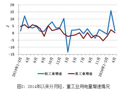 1-4月份,全國工業用電量12369億千瓦時,同比增長0.2%,增速比上年同期提高1.0個百分點,占全社會用電量的比重為68.4%,對全社會用電量增長的貢獻率為4.5%。其中,輕工業用電量2075億千瓦時,同比增長3.6%,增速比上年同期提高1.7個百分點;重工業用電量為10295億千瓦時,同比下降0.5%,增速比上年同期提高0.8個百分點。