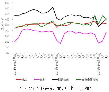 1-4月份,化學原料制品、非金屬礦物制品、黑色金屬冶煉、有色金屬冶煉四大高載能行業用電量合計5267億千瓦時,同比下降 4.4%,增速比上年同期回落2.7個百分點;合計用電量占全社會用電量的比重為29.1%,對全社會用電量增長的貢獻率為-47.8%。其中,化工行業用電量1405億千瓦時,同比增長4.0%,增速比上年同期提高1.1個百分點;建材行業用電量858億千瓦時,同比下降2.2%,增速比上年同期提高4.3個百分點;黑色金屬冶煉行業用電量1443億千瓦時,同比下降11.6%;增速比上年同期回落4.7個百分點;有色金屬冶煉行業1562億千瓦時,同比下降5.4%,增速比上年同期回落9.1個百分點。