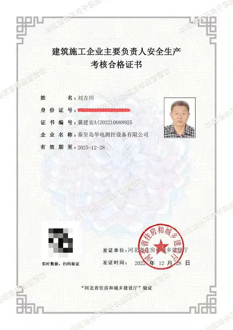 祝賀秦皇島華電測控設備有限公司獲批建筑施工安全生產許可證書