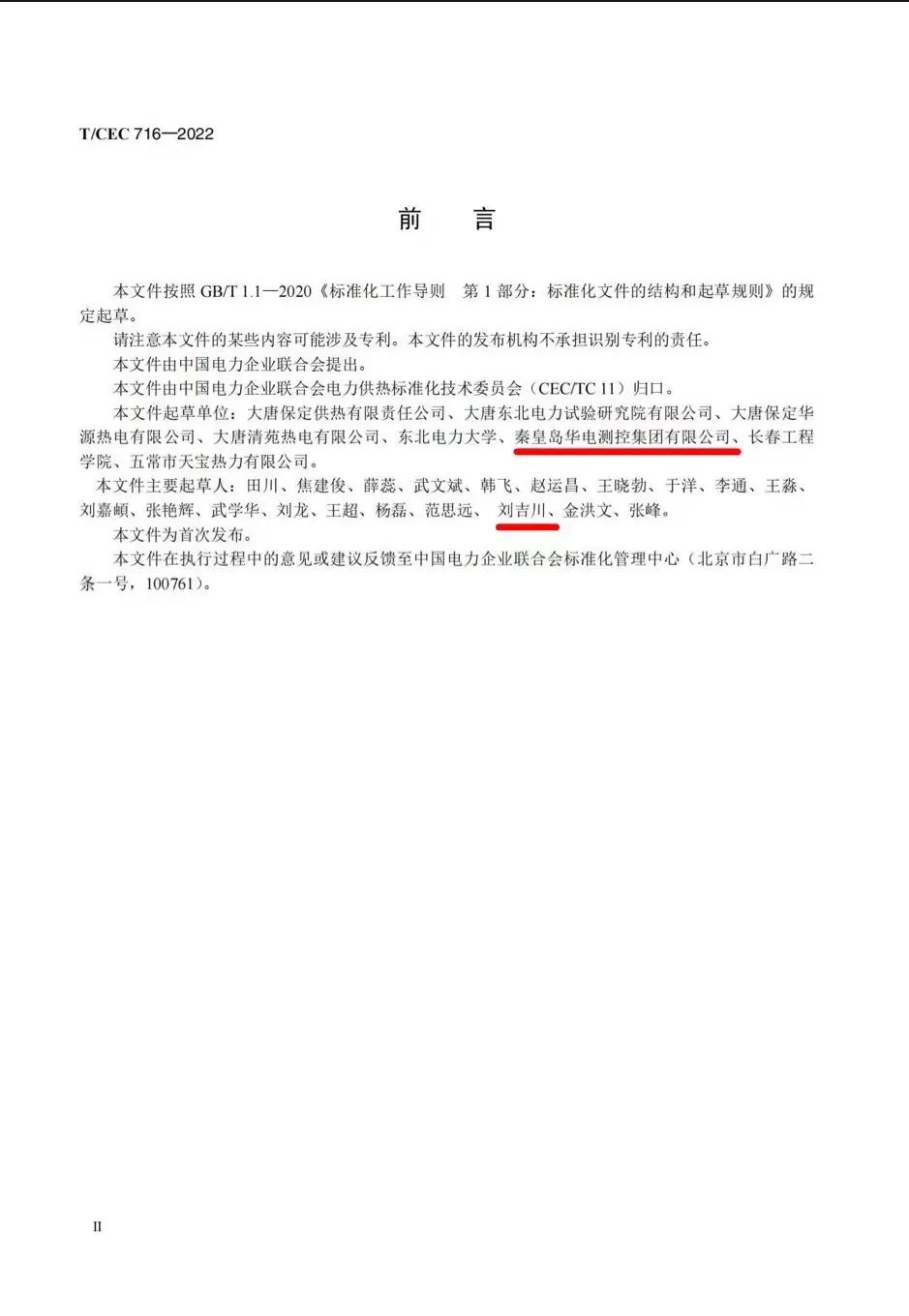 秦皇島華電測控集團有限公司參與編制的團體標準——《火力發電廠智能熱網供熱服務規范》(T/CEC 716—2022)于2022年10月26日由中國電力企業聯合會發布,2023年2月1日實施。該標準文件由中國電力出版社出版、印刷、發行,規定了火力發電廠智能熱網供熱服務的質量與要求、運行與維護、服務與管理、服務質量評價等。