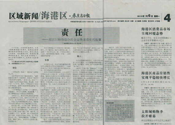 2015年7月6日,秦皇島日報第四版,以《責任》為題大篇幅報道了秦皇島華電測控設備有限公司總經理劉吉川先生的個人思想和創業經歷。在此之前,劉總也曾多次被《燕趙都市報》、《秦皇島日報》、《秦皇島晚報》等媒體采訪和報道。以下為報道內容: