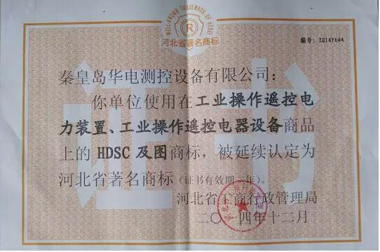近日,公司收到河北省工商行政管理局頒發的“河北省著名商標”證書。這是公司使用在工業操作遙控電力裝置、工業操作遙控電器設備商品上的HDSC及圖商標,繼2008年首次被認定為“河北省著名商標”后的連續認定,證書編號為:2014Y644。
