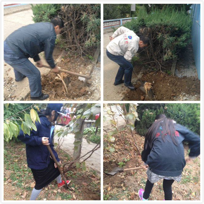最后一組負責鏟除花壇中枯死的樹根,大家奮勇爭先、眾志成城,終于順利鏟除了花壇中的四個“根深蒂固”的老樹根。