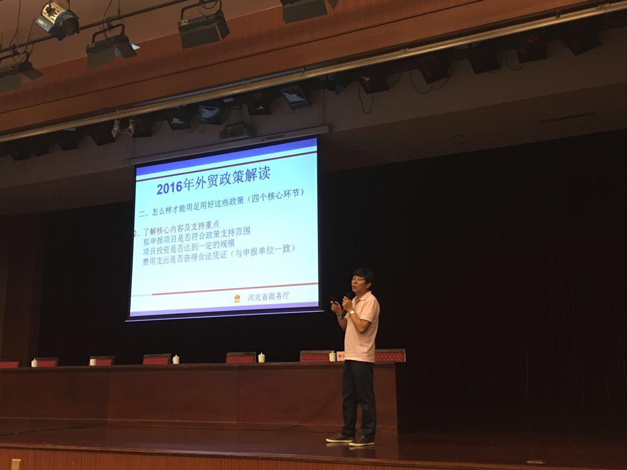 本次主題培訓在秦皇島大酒店舉辦。培訓的第一課是由省商務廳外貿處處長權奇衡解讀了國務院《關于促進外貿回穩向好的若干意見》和省政府辦公廳《關于 2016年全省外貿攻堅行動方案的通知》,他詳細解讀了國務院和我省為了加快培育外貿競爭新優勢的相關政策;接下來來自省貿促會展覽部的王曉曼部長講解了出國展覽及國際市場開拓,她詳細地為大家講解了出國展覽的相關注意事項以及如何利用展覽去開拓國際市場;隨后省國稅局進出口處副處長王翠蓮為我們解讀了出口退稅相關政策,介紹了退稅流程和相關最新退稅手續;省外匯管理局經常項目處主任科員于慶榮講解了貨物貿易外匯管理業務;秦皇島海關稽查科科長王素素解讀了海關企業信用管理暫行辦法,同時中信保河北分公司處長助理孫東坡解讀了出口信保的相關政策;最后阿里巴巴秦皇島負責人賈東華為我們講述了“大數據讓中國外貿更美好”的課程,介紹了大數據時代的機遇與挑戰。