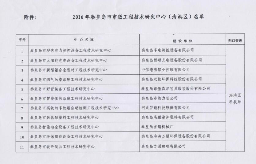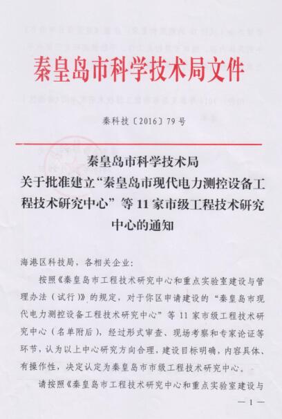2016年公司申請建設的“秦皇島現代電力測控設備工程技術研究中心”市級工程技術研究中心,經過秦皇島市科學技術局組織進行的形式審查、現場考察和專家論證等環節,認為中心研究方向合理,建設目標明確,內容具體、有操作性,被認定為秦皇島市市級工程技術研究中心。