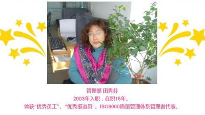 【“印象•華電”系列報道】難忘的ISO9000取證之旅” 2018-04-04管理部 田秀芬2003年入職,在職15年。曾獲“優秀員工”、“優秀報道員”。ISO9000質量管理體系管理者代表。 作為一名在職十五年的老員工,我與華電測控一路走來、共同成長,有很多美好的回憶和動人的故事,今天我要講More