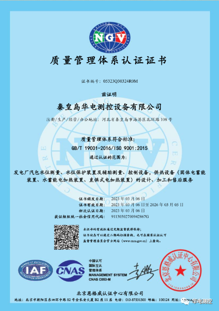 華電測(cè)控順利通過(guò)ISO9001質(zhì)量管理體系再認(rèn)證” 2023-03-072023年3月7日,秦皇島華電測(cè)控設(shè)備有限公司收到來(lái)自北京恩格威認(rèn)證中心頒發(fā)的《質(zhì)量管理體系認(rèn)證證書(shū)》,這表明華電測(cè)控2023年ISO9001質(zhì)量管理體系再認(rèn)證順利通過(guò)!秦皇島華電測(cè)More